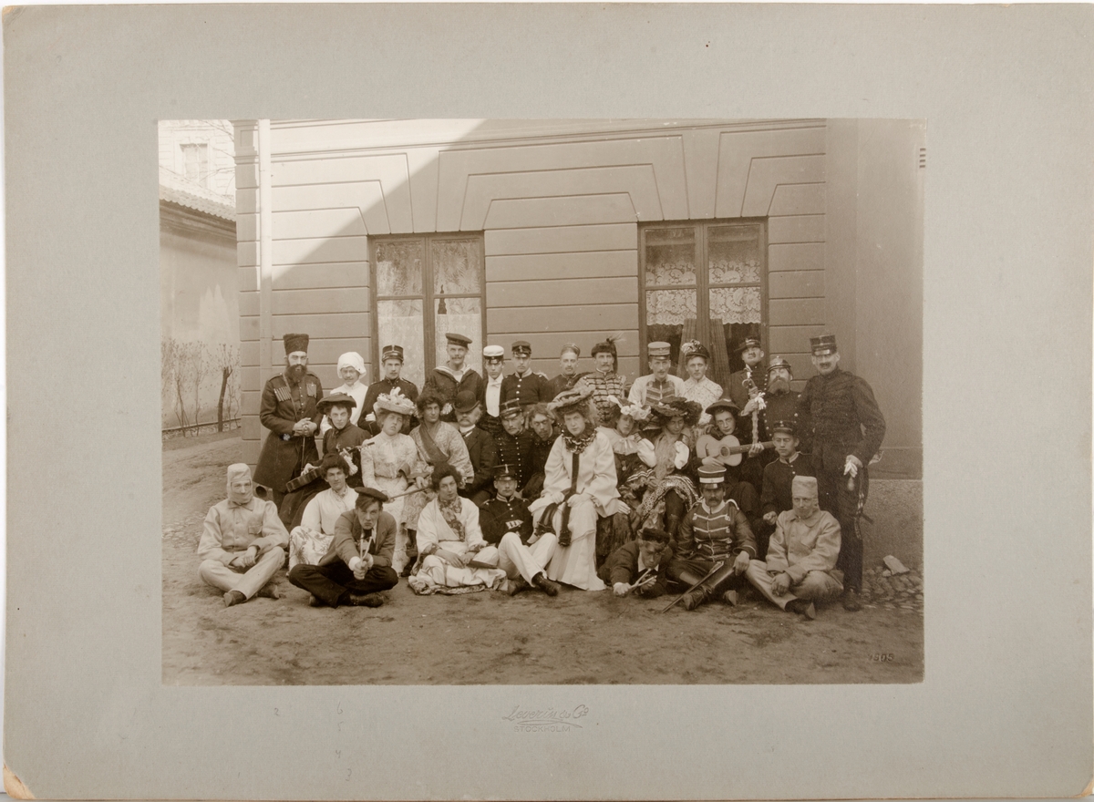 Spexutklädda studenter på Stockholms nations gård, Uppsala 1905