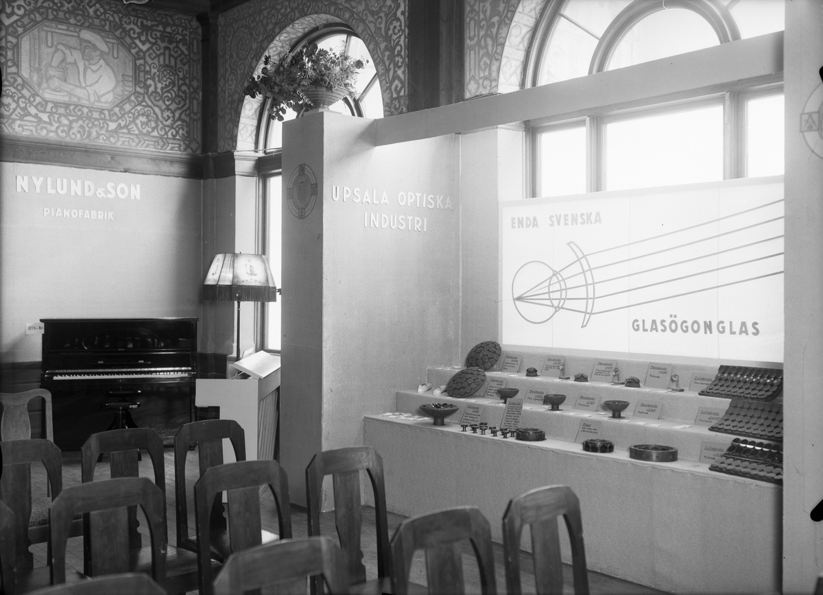 Nylund & Sons och Uppsala Optiska Industris montrar i stora utställningssalen på Upsala Fabriks- och Handtverksförenings utställning, nedre botten, Nedre Slottsgatan 6