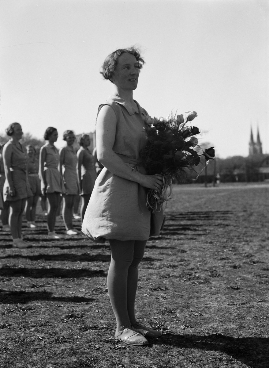Gymnastikdirektör Märta Larsson, den kvinnliga gymnastikgruppens ledare, "fick mottaga en blomsterkvast" av Upplands Gymnastikförbund på Studenternas Idrottsplats