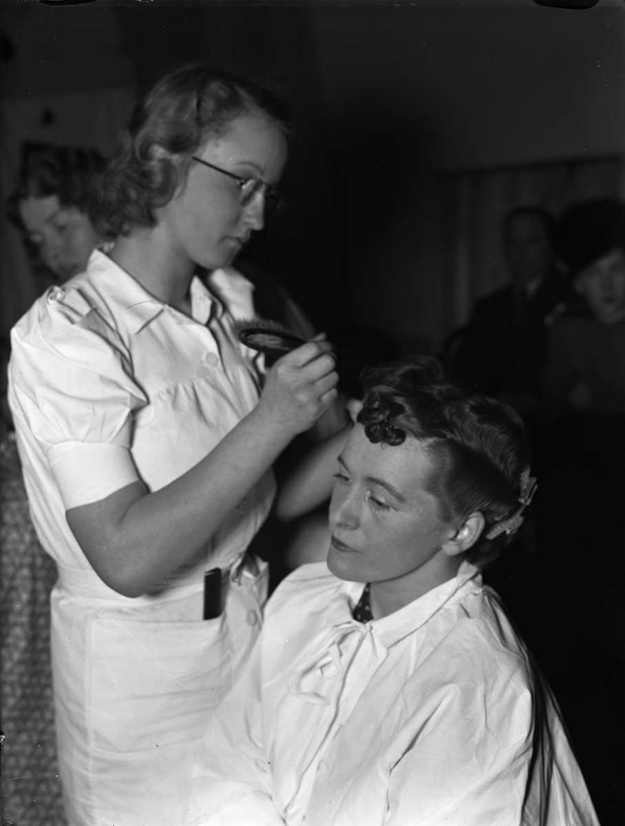 "En av de tävlande unga damerna i aktion" på Svenska frisörföreningens avdelning 10 D Uplands tävling, Stadshotellets festvåning, Trädgårdsgatan