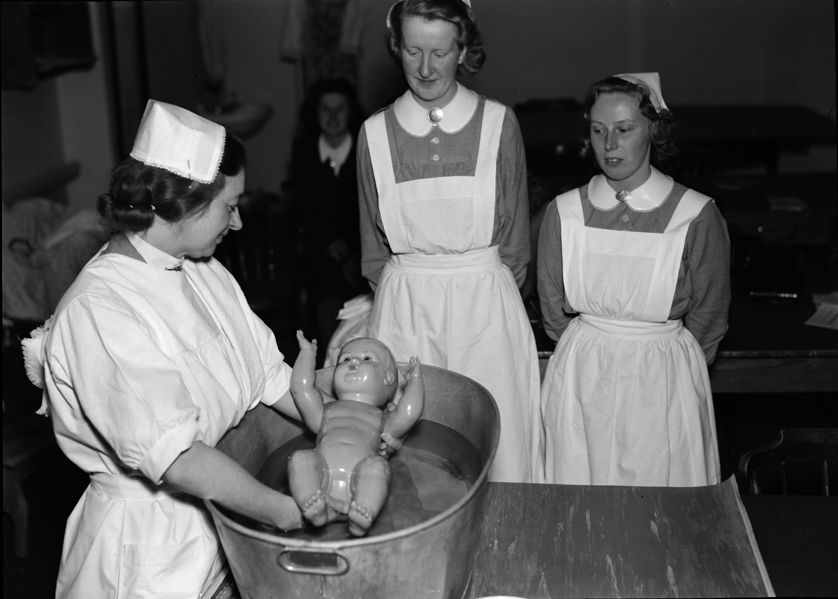 "Fröken Harriet Kinch visar med dockan 'Lasse' hur babybad tillgår" under Uppsala stads barnavårdsnämnds kurs i barnavård på Fackskolan för huslig ekonomi