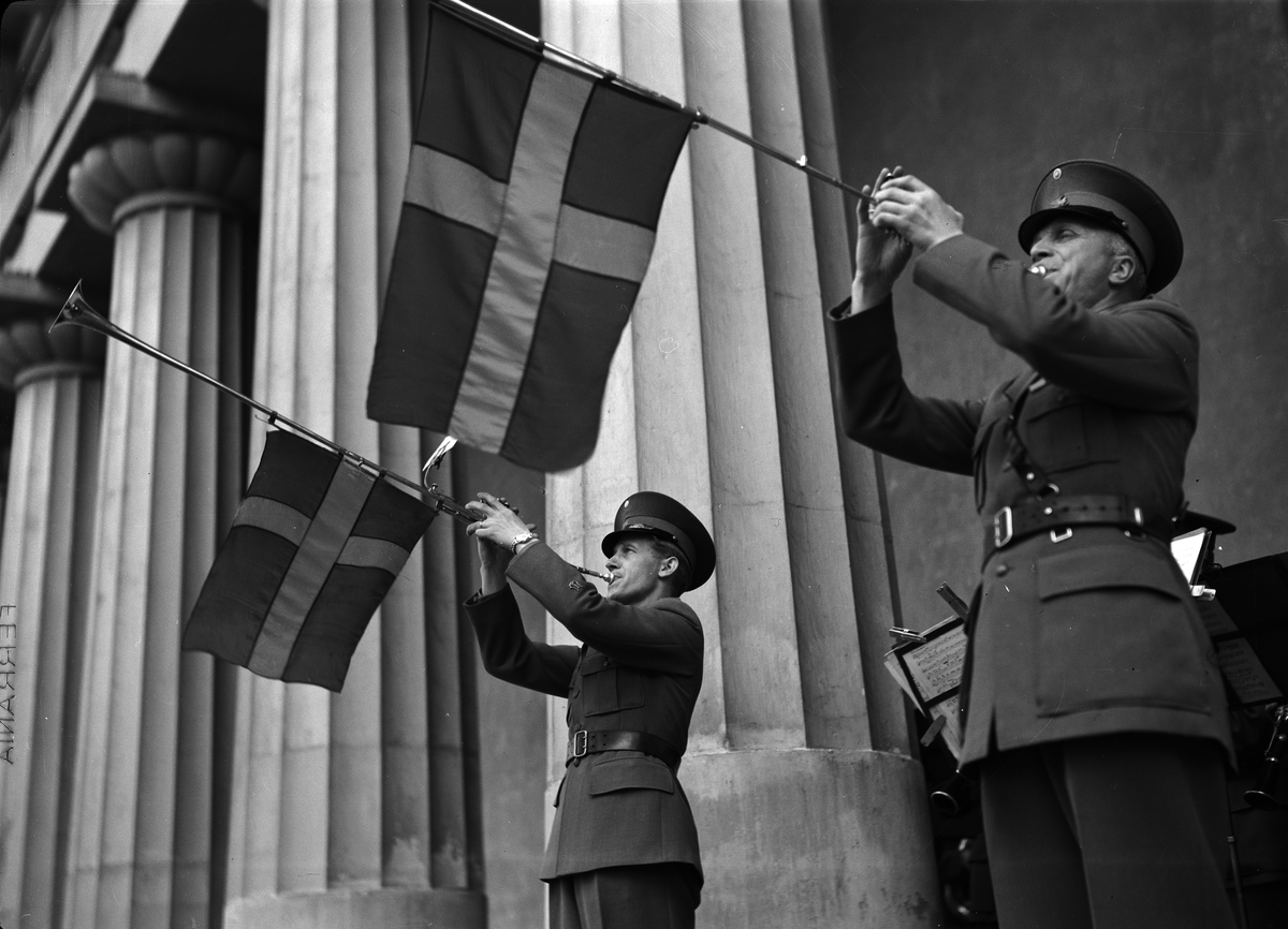 Musiker ur Upplands Regementes musikkår spelar på Uppsala studentkårs vårfest i Botaniska trädgården