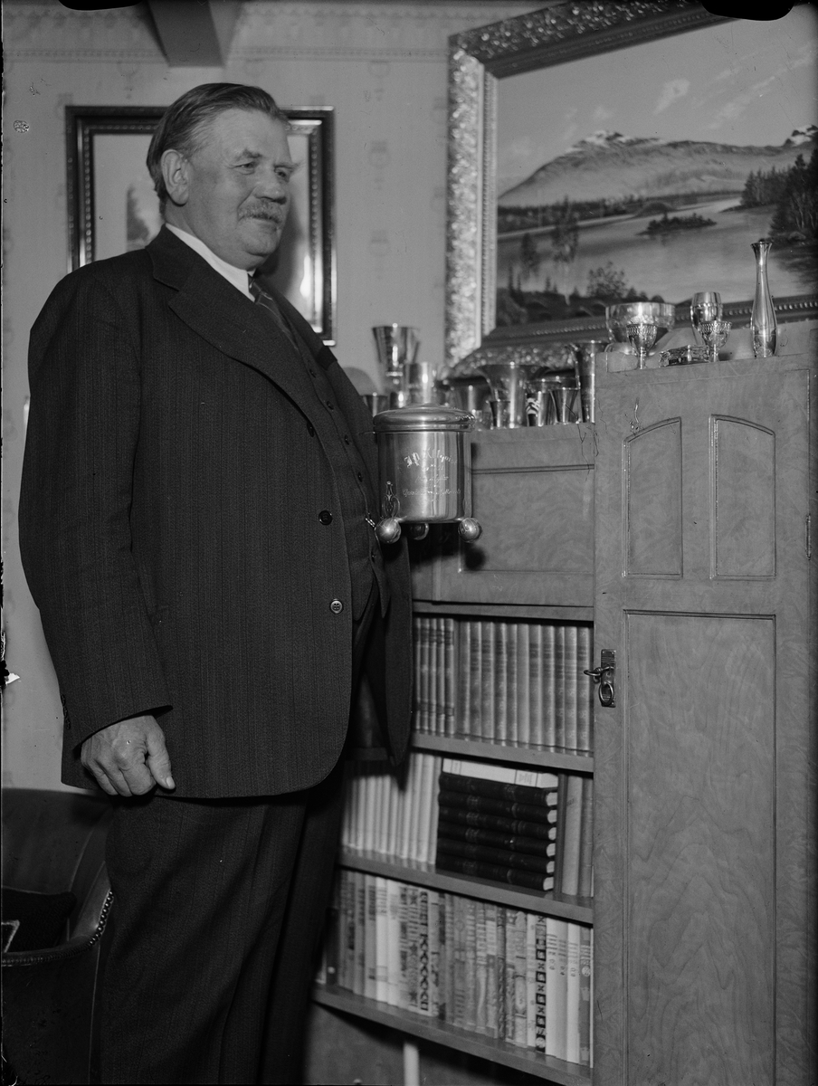 Befallningsman Johan Petter Ahlkvist framför sin samling av skyttepriser