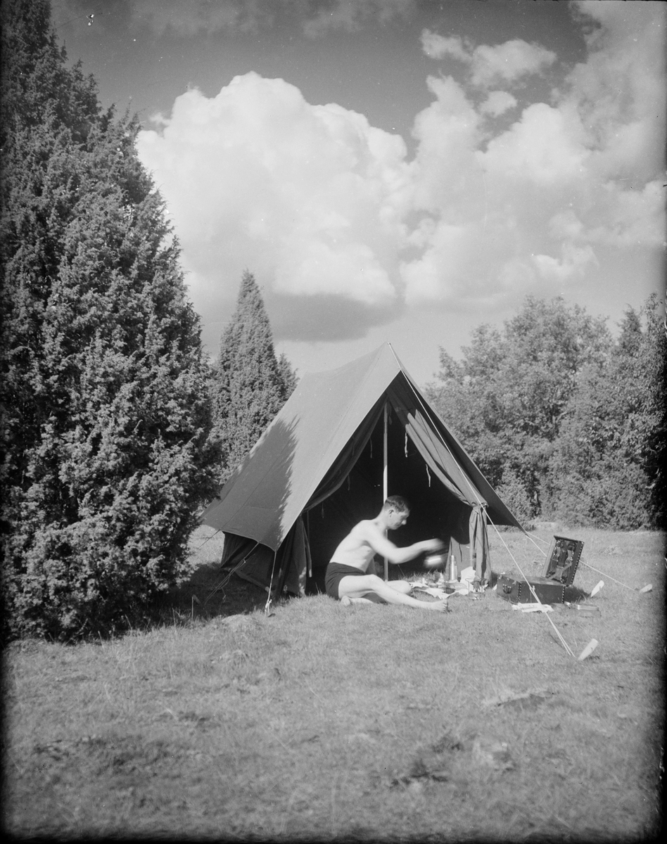 Josef Edhlund med kaffepanna och spritkök utanför tältet, Sverige