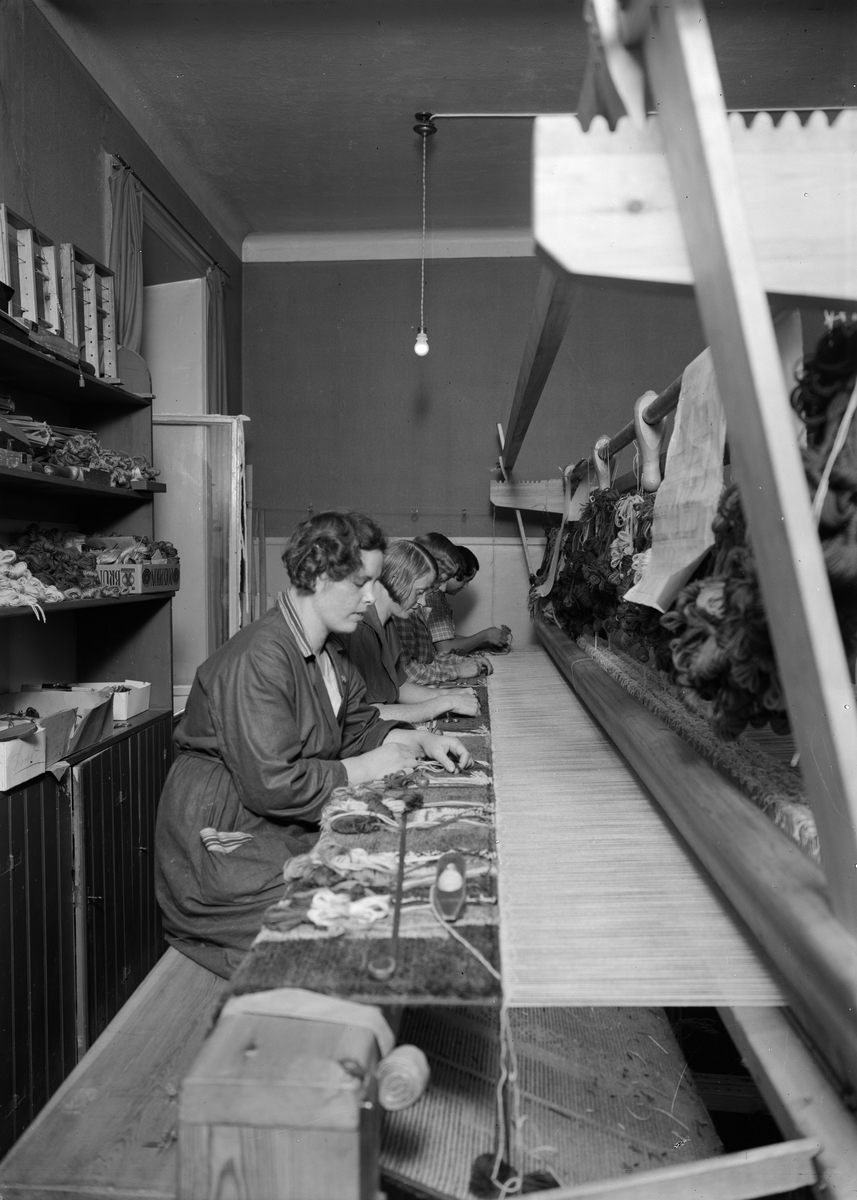 "Flinka fingrar i verksamhet på Hemslöjden", väver kormatta i Sveriges största handvävstol, Fyristorg 8