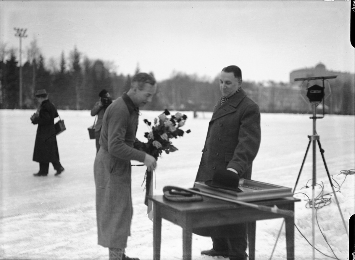 Bandyspelaren Sune Almkvist uppvaktas inför 50-årsdagen av "kapten Bergman", Studenternas Idrottsplats, Kronåsen
