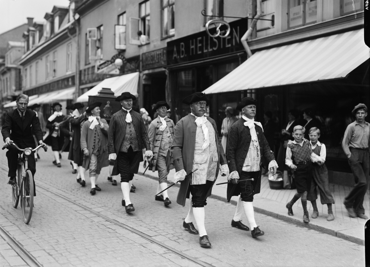 "Hantverkstågets mästare och gesäller i tidstrogen kostymering utgjorde ett pittoreskt inslag i festligheterna" när Upsala Fabriks- och handtverksförenings utställning invigdes, Vaksalagatan
