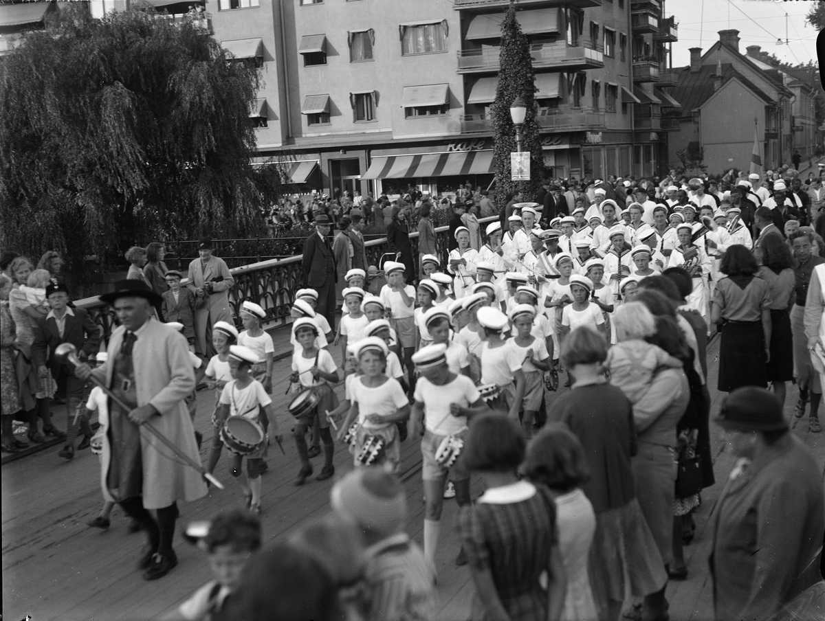 Barnparad med byggmästaren Anders Diös i täten passerar Islandsbron vid invigningen av Barnens Dag