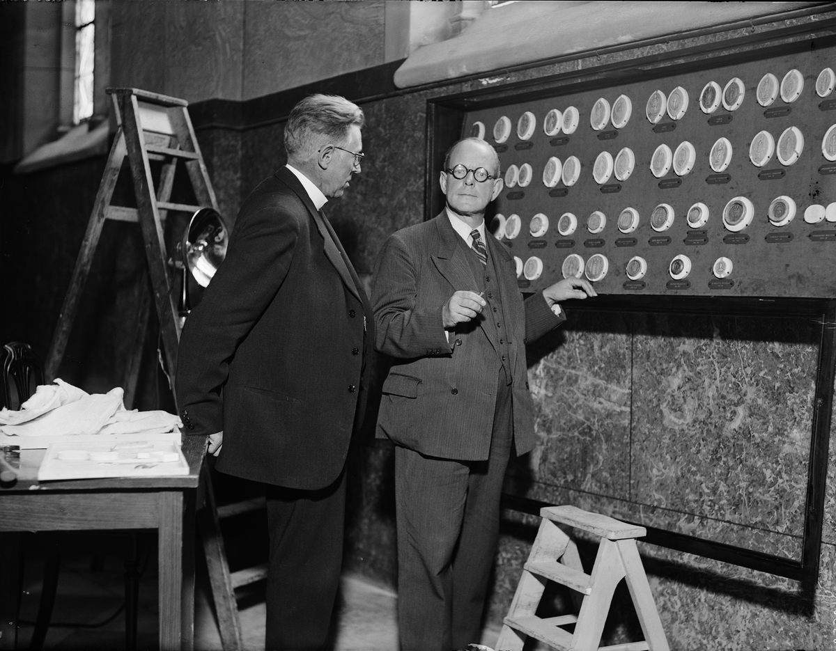 Konservator Gustaf Fleetwood och domkyrkosyssloman Mats Åmark vid utställningen av medeltida sigill i Oxenstiernska koret i Uppsala domkyrka
