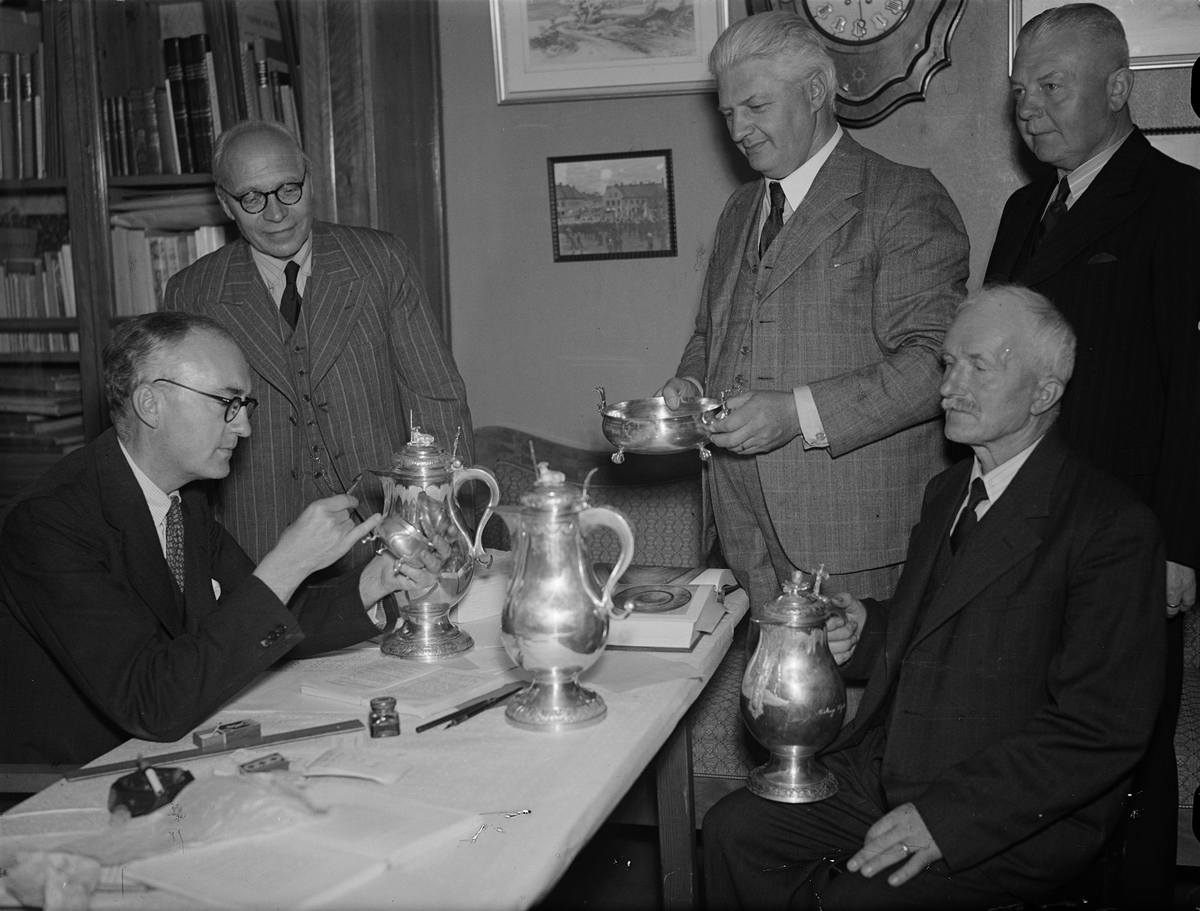 Intendent Nils Ålenius vid Upplandsmuseet besiktigar silverföremål, i samband med silverutställning hos Uppsala Fabriks- och hantverksförening, Nedre Slottsgatan, Uppsala 1944
