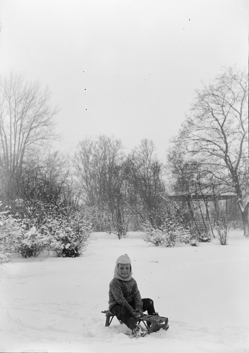 Sannolikt en av Christiane och Ruben Liljefors söner, åker med kälke ute på gården, sannolikt i Sverige