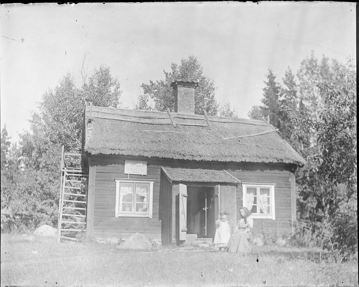 Kvinna och barn utanför torp, Sigtuna, Uppland