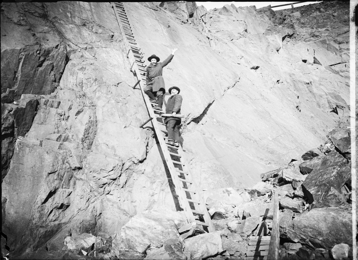 Två män på stegen i gruvschakt, Falun, Dalarna
