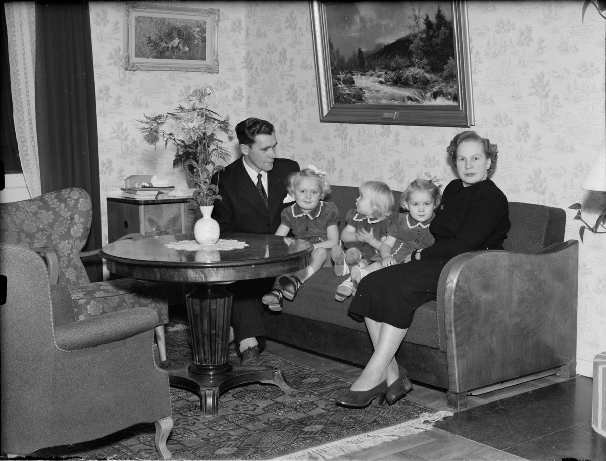 Man, kvinna och tre barn sitter i soffan, Östhammar, Uppland,