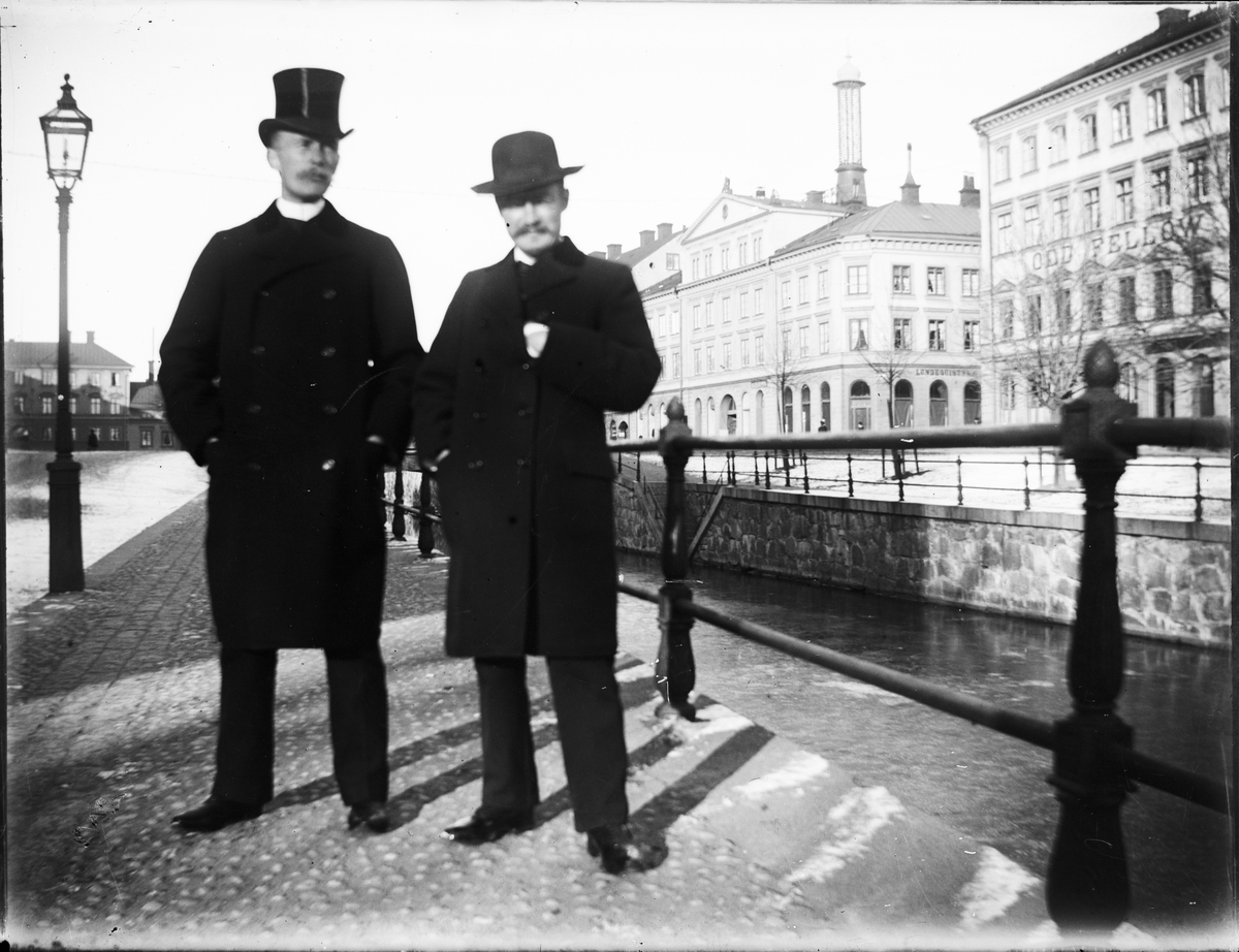 Två män på Västra Ågatan vid Fyrisån, Uppsala