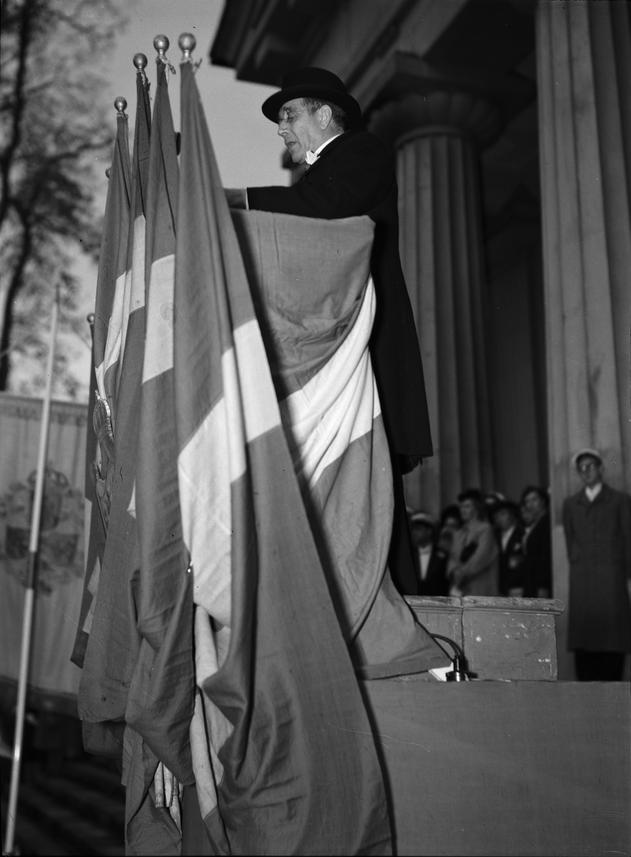 Rector magnificus professor Thore Engströmer talar på Uppsala Studentkårs vårfest i Botaniska trädgården