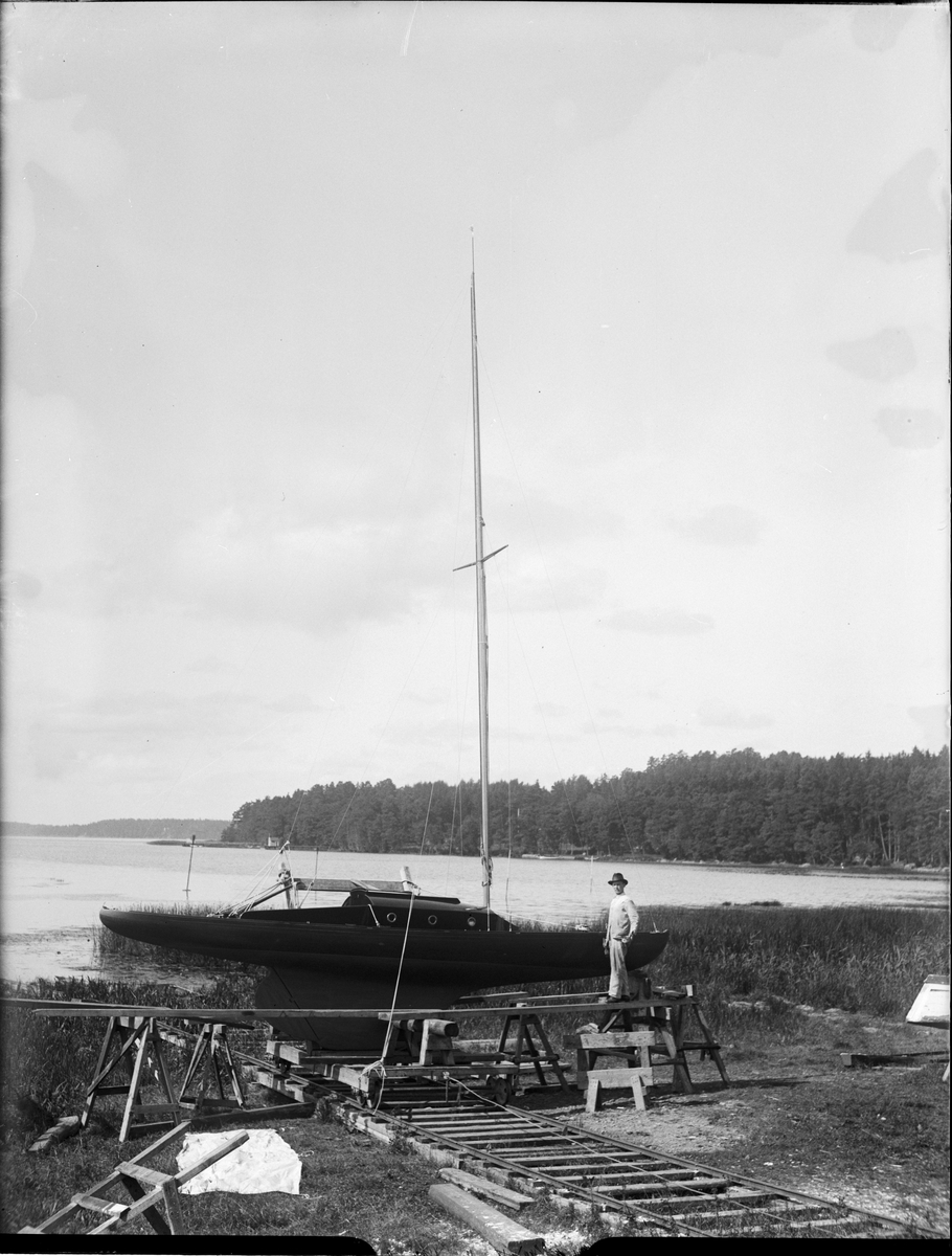 Man med penslar i handen vid en båt, Uppsala