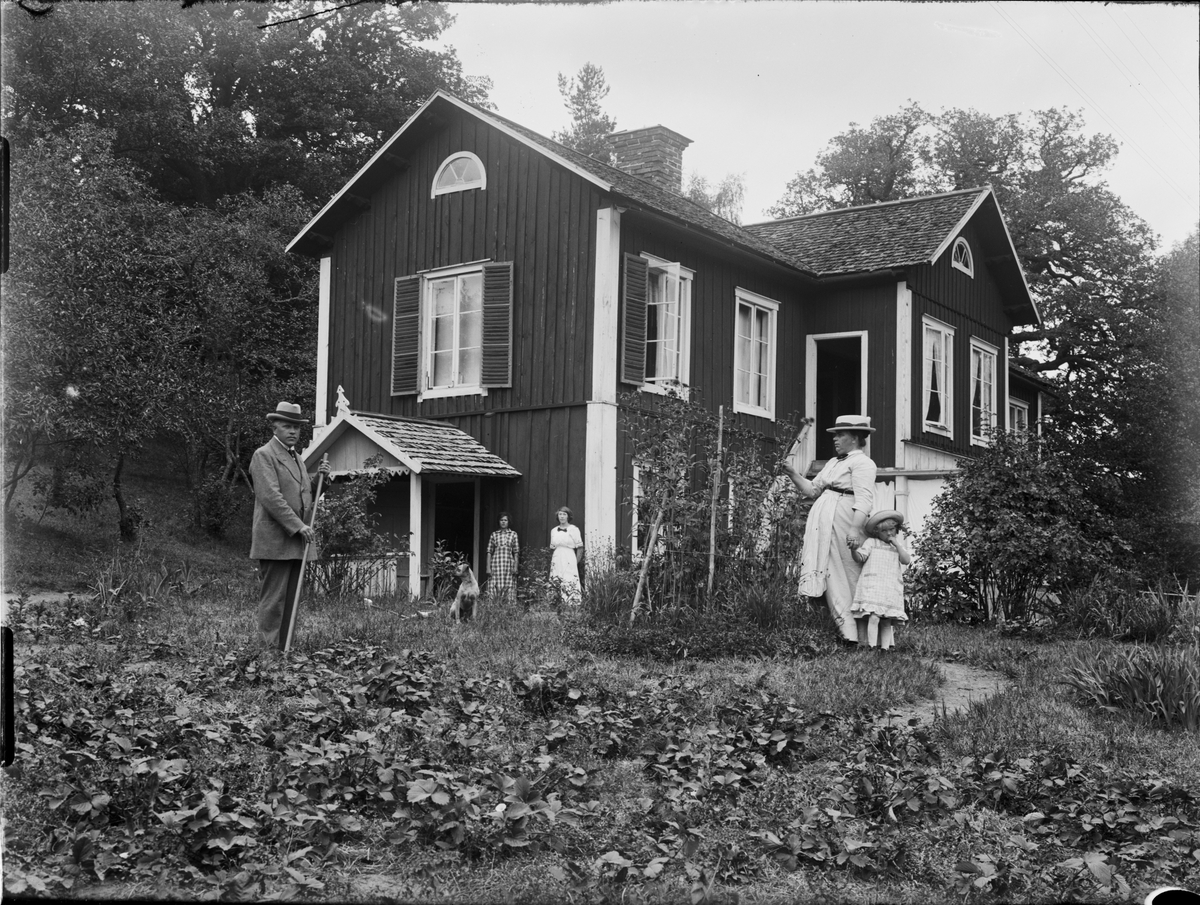 Man, kvinnor och barn i trädgården