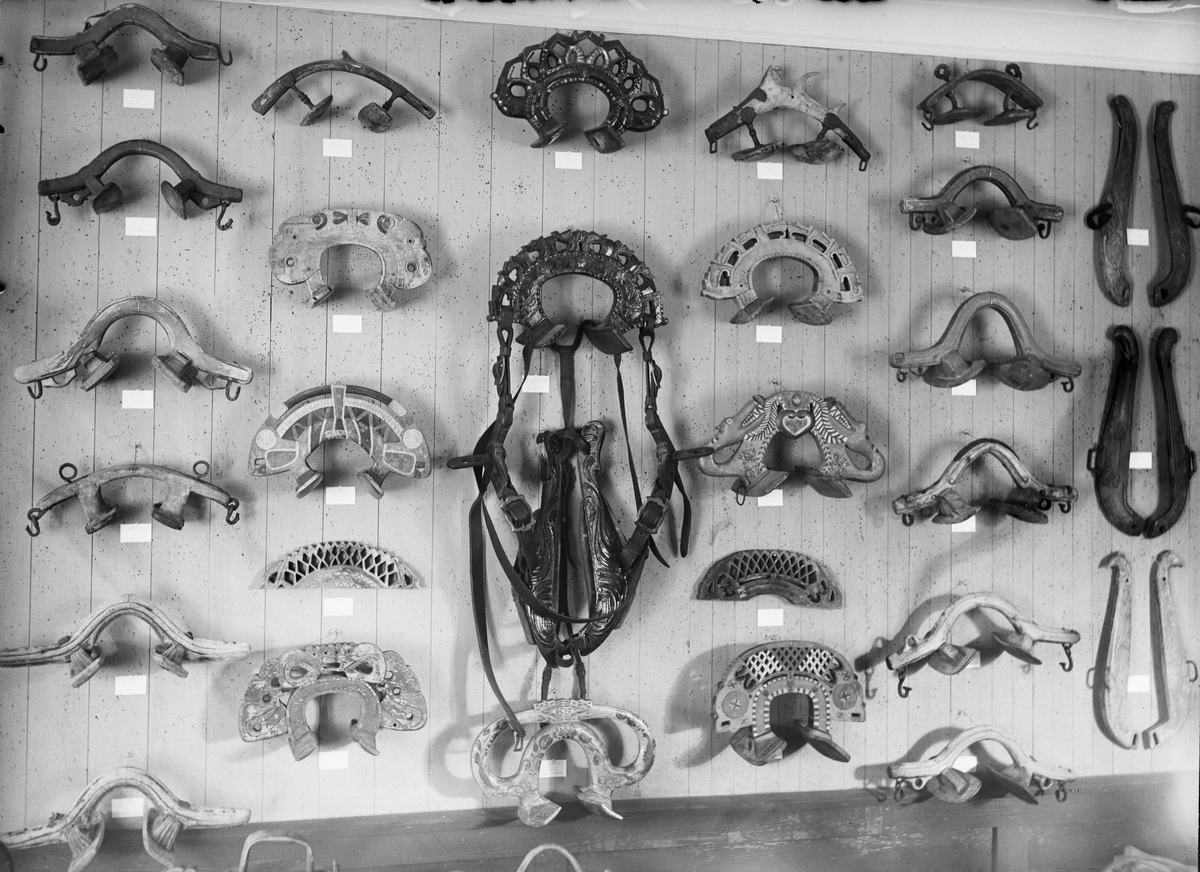 Utställning av selbågar och lokor, sannolikt ur Upplandsmuseets samlingar, Uppsala