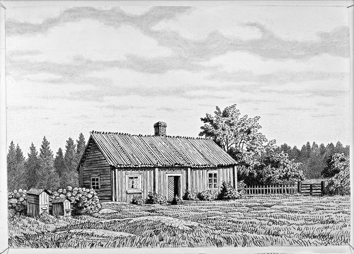 Konstverk - teckning med motiv från gården Nyboda, Hållen, nära Fågelsundet, Uppland, signerad 1928 av konstnären Olof Thunman
