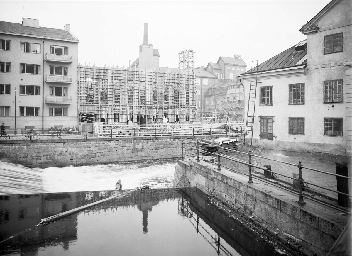 Uppsala stadsbibliotek och Centralbadets simhall under uppförande, Östra Ågatan, Uppsala oktober 1940
