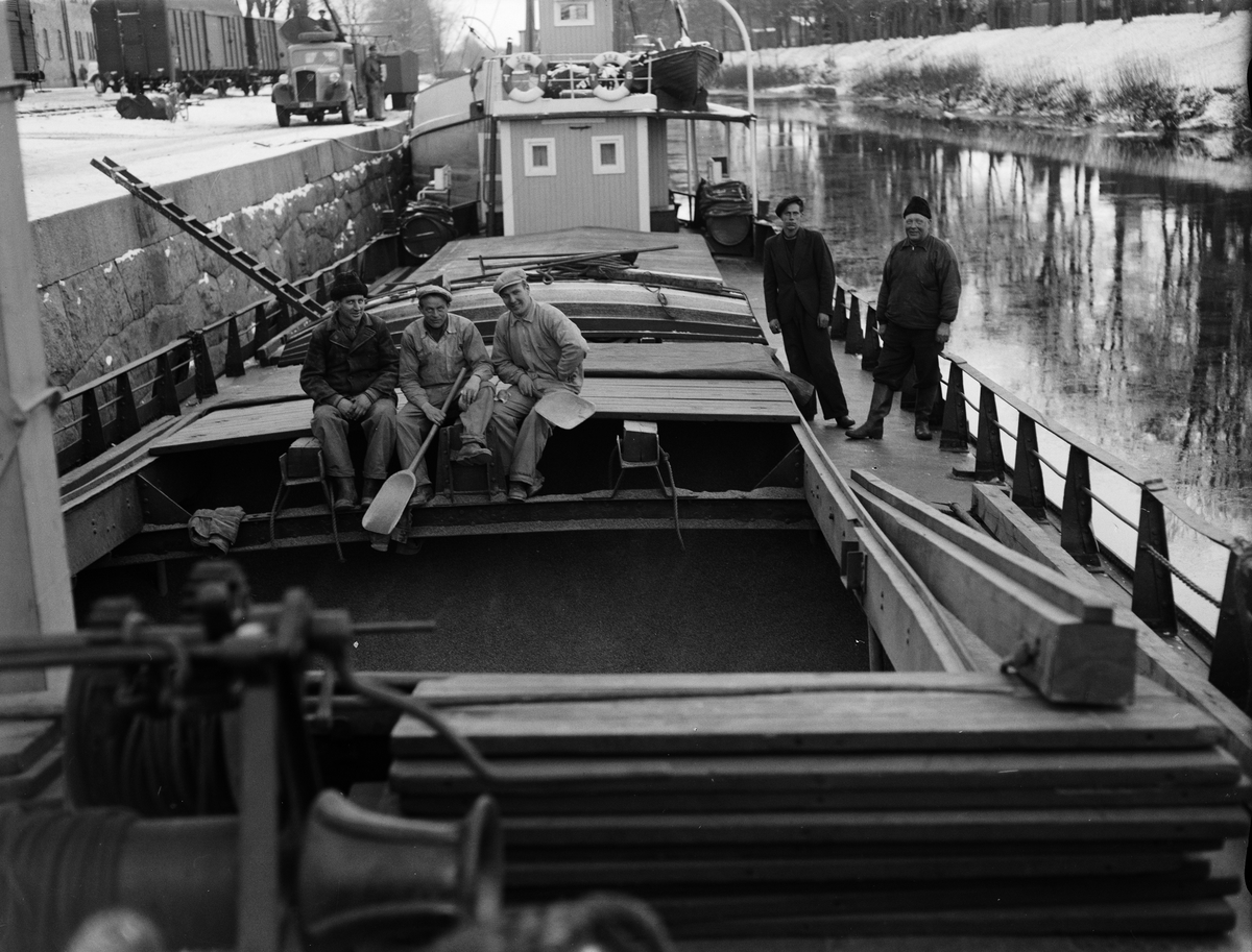 Besättningen på pråm som lossar 307 ton råg i Fyrisån nedanför Upsala Ångqvarns AB i Kungsängen