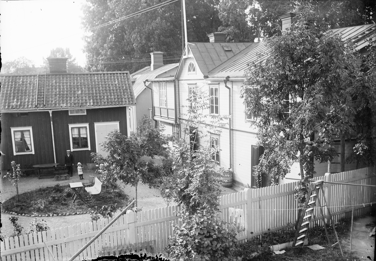 Handlande Robert Almgrens med familj på sin gård i hörnet av Drottninggatan och Kyrkogatan, Östhammar
