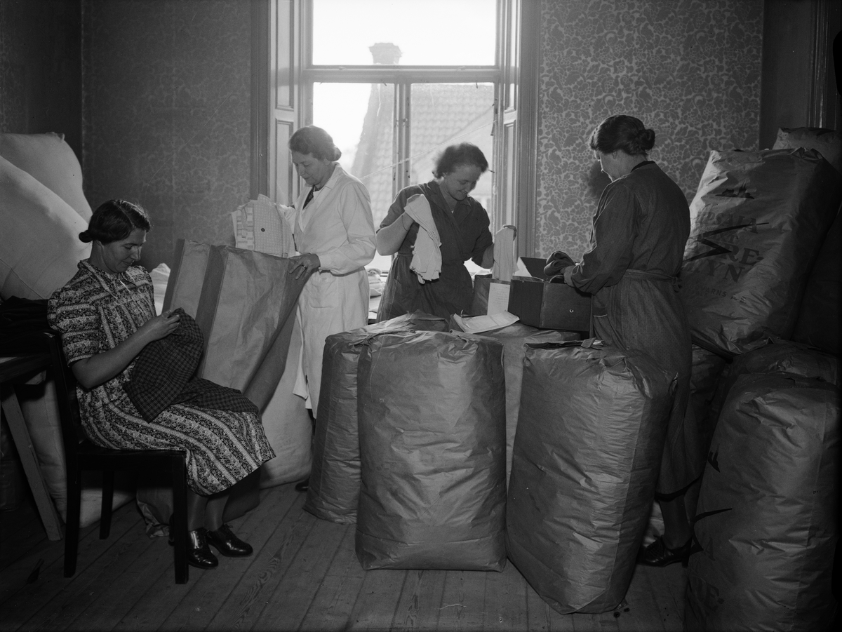 Kvinnor packar kläder som samlats in av Svenska Norgehjälpen, Kungsgatan 12