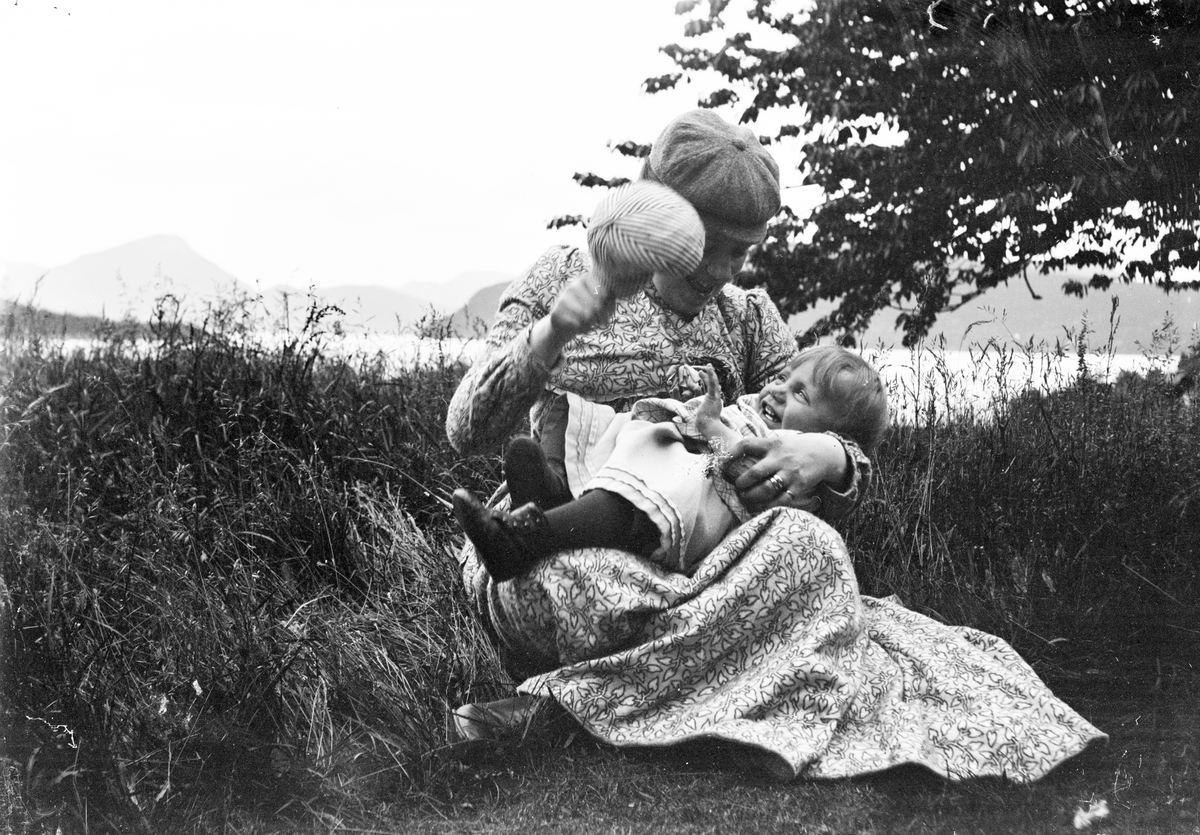 Christiane Liljefors sitter ute på gräsmattan med sin lilla dotter Marit i famnen, sannolikt i Norge