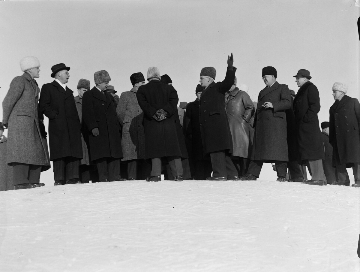 Professor Sune Lindqvist berättar om Gamla Uppsala för tyska pressmän inbjudna av Utrikesdepartementet