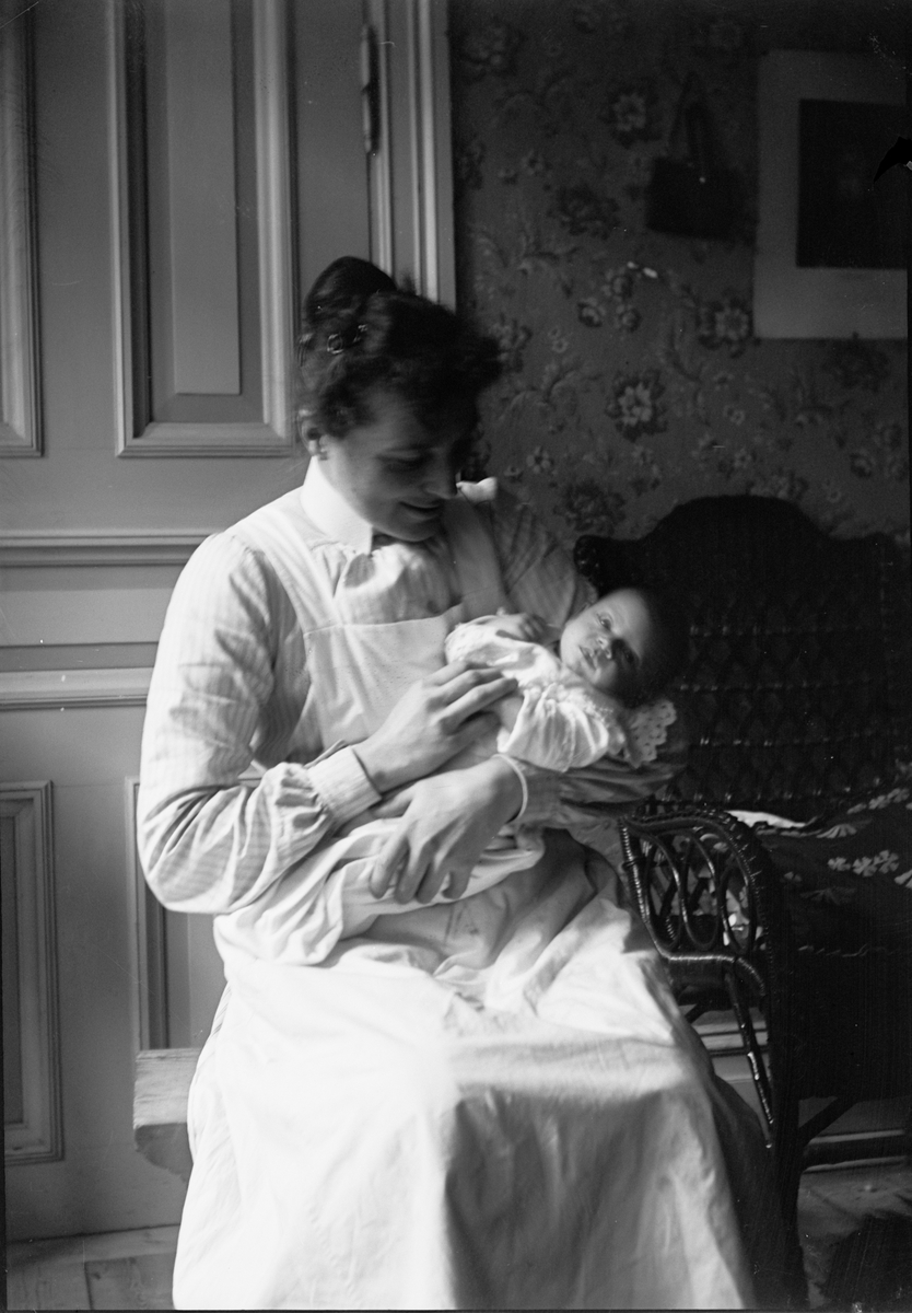 Kvinna med spädbarn i famnen i hemmet, sannolikt i Sverige