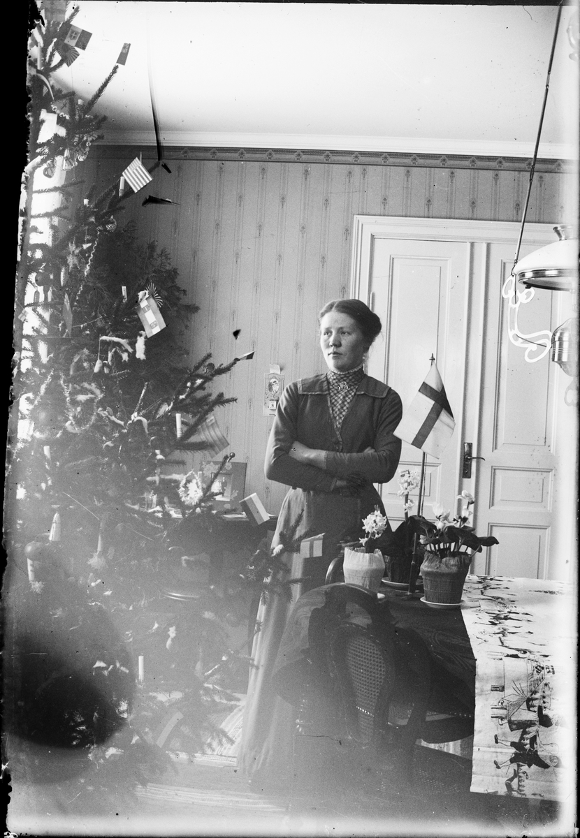 Ruth Skötsner vid julgranen i hemmet, Östhammar, Uppland