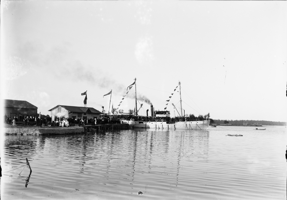 "Ångfartyget Östhammar I prydd med flaggspel lämnar Östhammars hamn", Uppland 1900