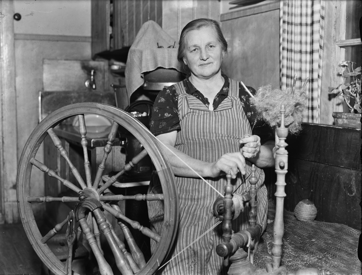 Jordbrukare Agnes Gustafsson vid spinnrocken, Jutbol, Rasbo