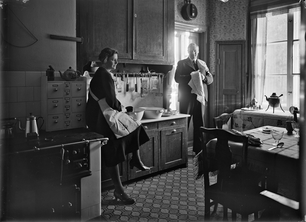 Kvinna och man i kök, sannolikt Uppsala 1933