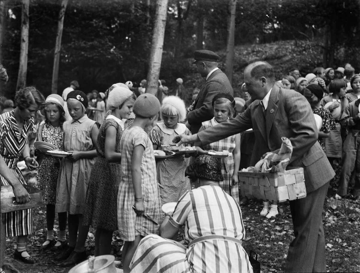 Utdelning av mat på SMK Uppsalas utflykt för Uppsalabarn, sannolikt Länna i Almunge socken