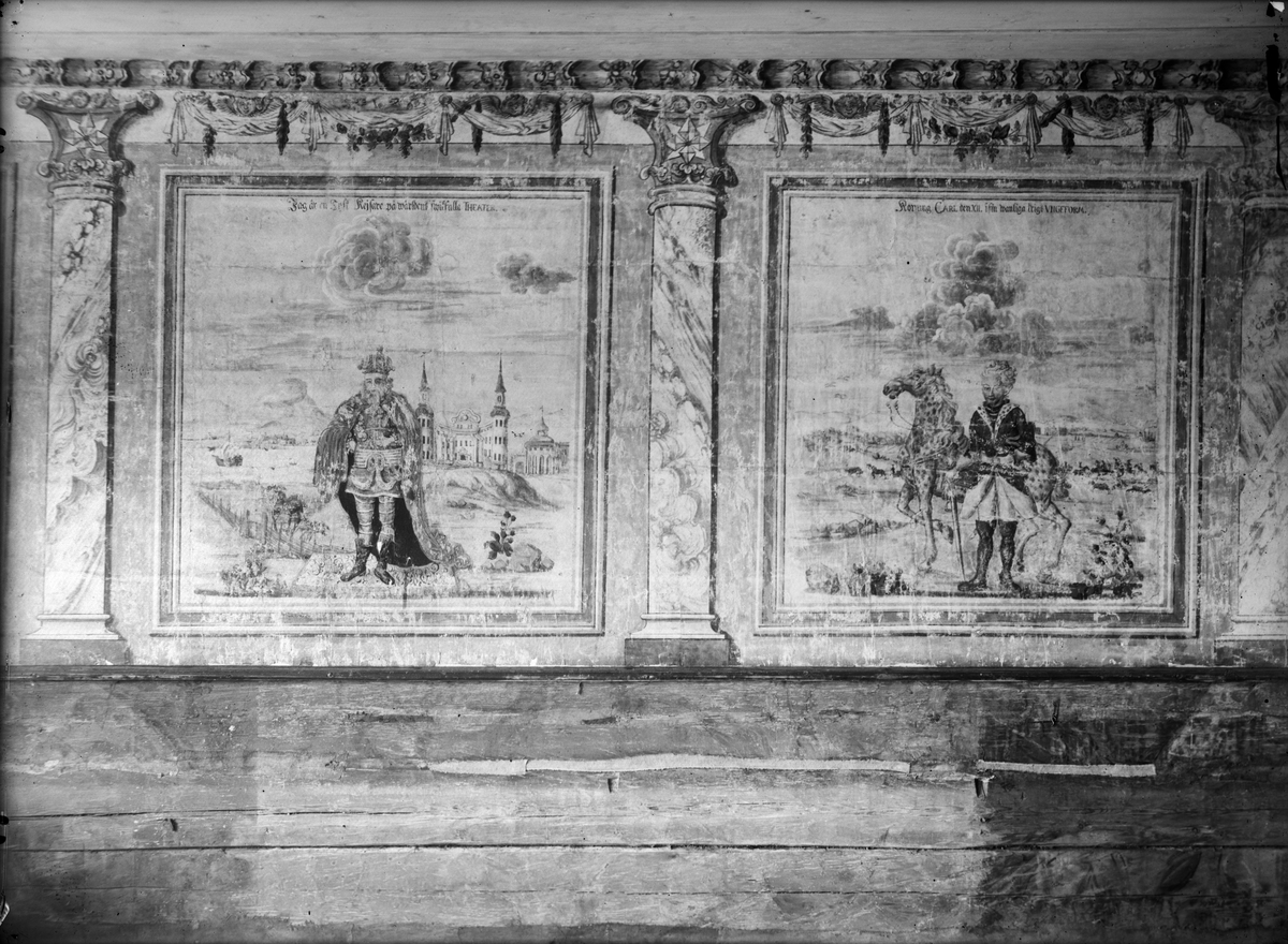 Väggmålning av allmogemålaren Hans Wikström i salen i Bärbystugan på friluftsmuseet Disagården, Gamla Uppsala