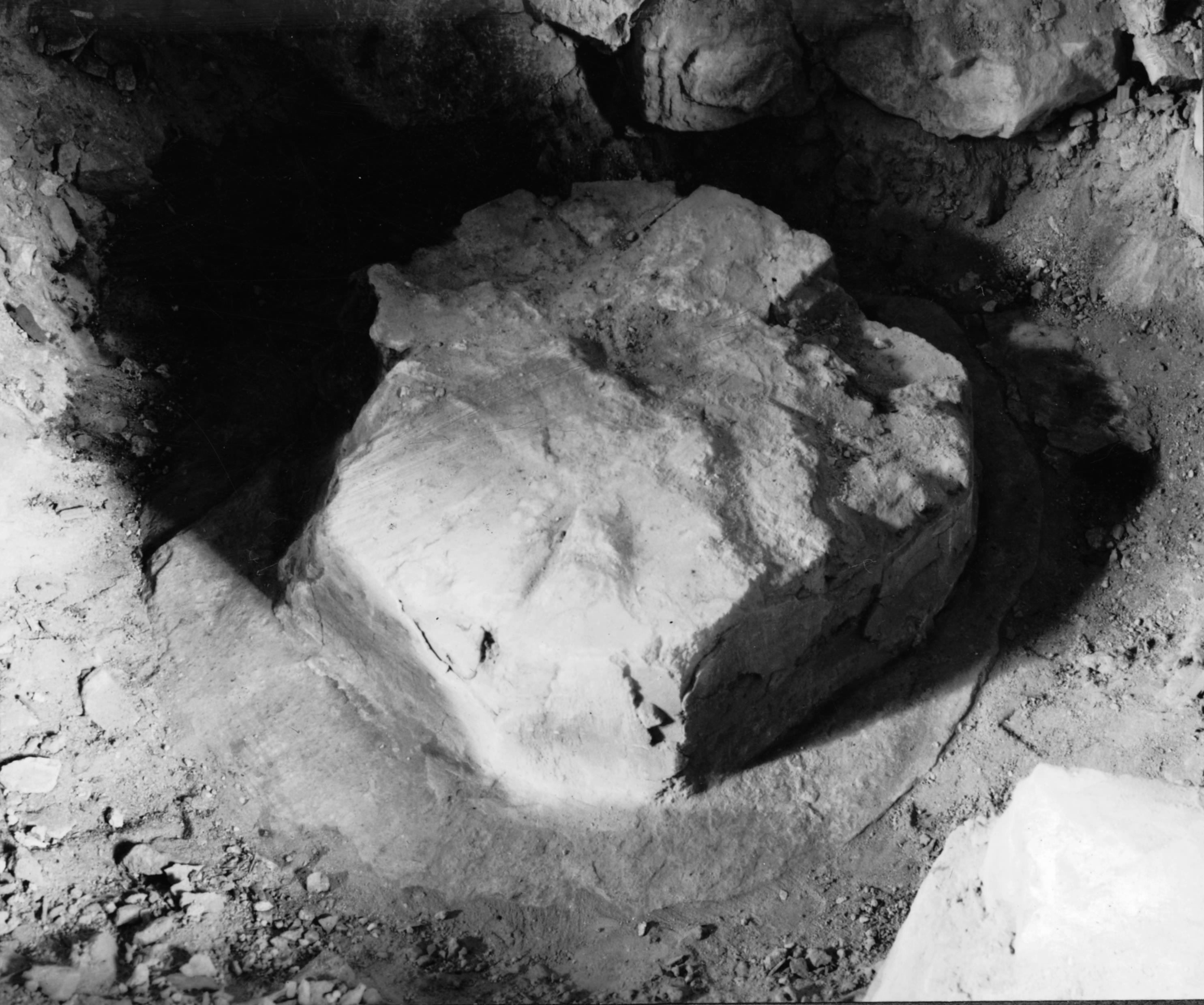 Den västra mittpelaren frilagd. Basen som var byggd av tegel, låg på stor rund sten som underlag, vars kontur skymtar i bottnen.