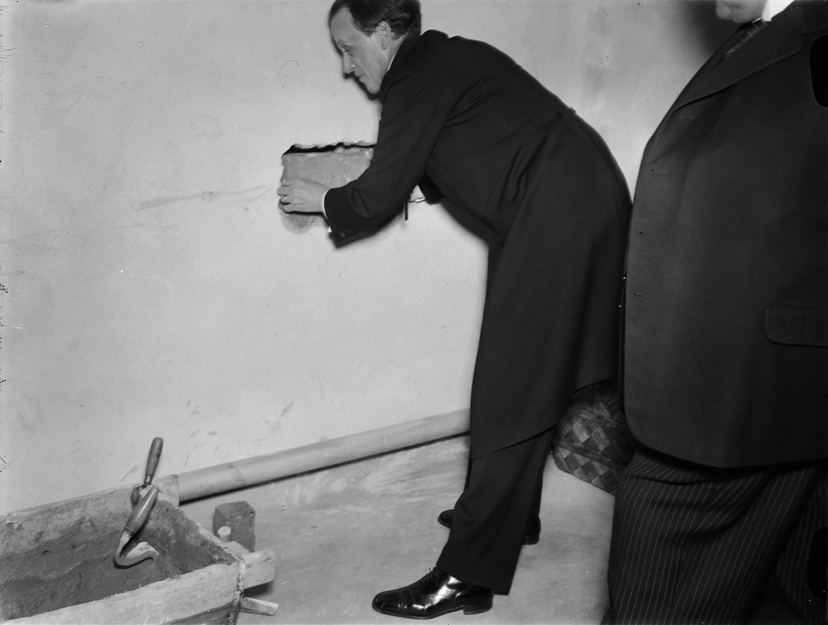 Ärkebiskop Erling Eidem murar in ett dokumentskrin i en källarvägg vid invigningen av Stiftelsen Frideborgs hem för prästänkor, Sysslomansgatan 35