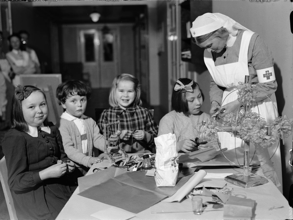 "Syster Märta" visar hur man gör julgransprydnader på avdelningen för finska flyktingbarn på Akademiska sjukhuset