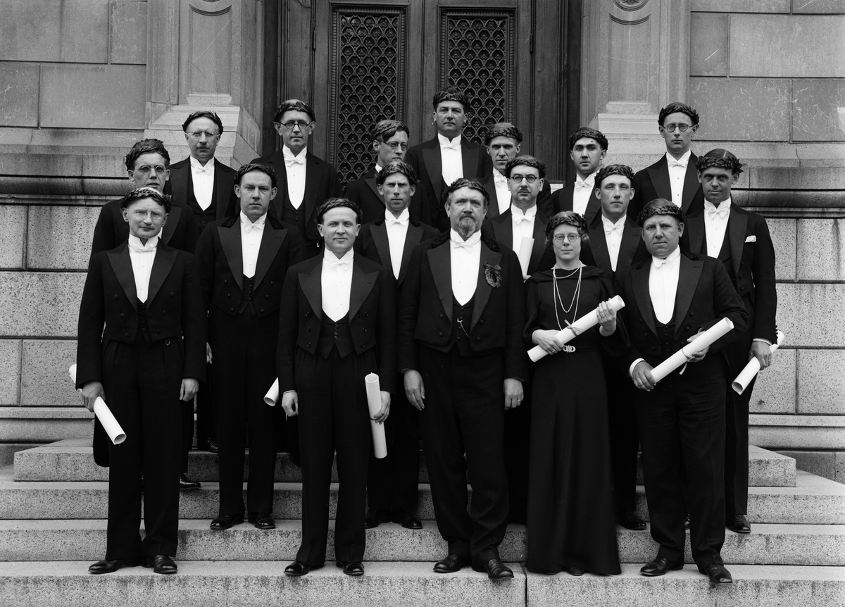 Doktorspromotion vid Uppsala universitet - "årets filosofiska doktorer med promotor prof. Linders" samlade på Universitetshusets trappa