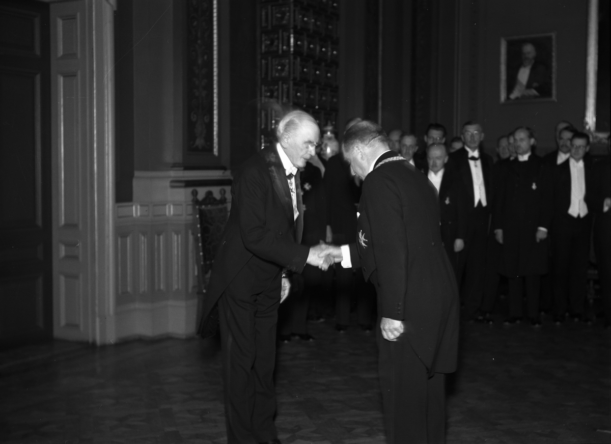 Uppsala universitets rektor Thore Engströmer avtackar den avgående universitetskanslern Ernst Trygger, kanslersrummet i Universtietshuset