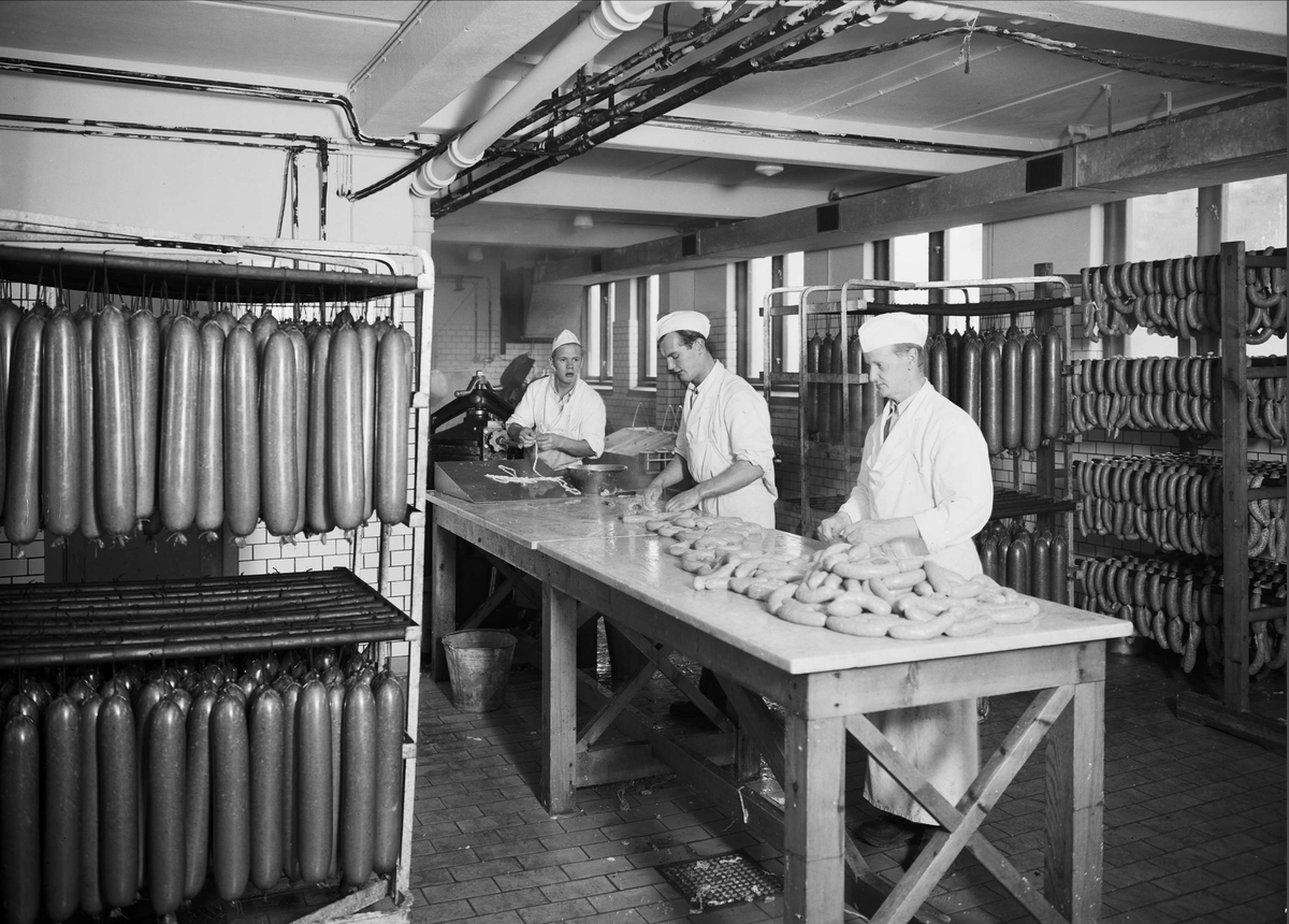 Korvproduktion på Stockholm-Gävle Slakteriförening i Kungsängen