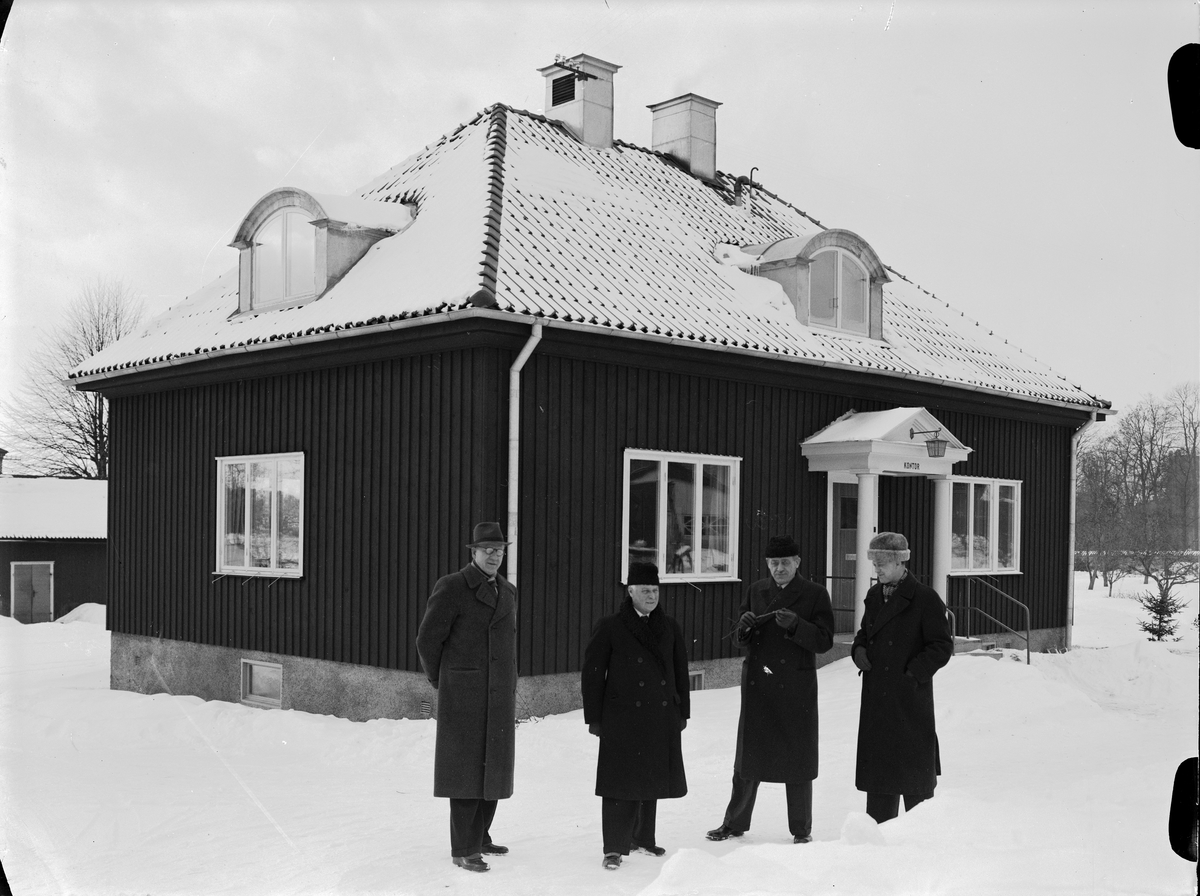 Uppsala Läns Plantskolas nya kontorsbyggnad i kvarteret Plantskolan. Framför byggnaden står plantskolans styrelsemedlemmar - godsägare W E Silfverhjelm, sekreterare Henrik Nystedt, direktör K H Modén och agronom Gösta Herbe