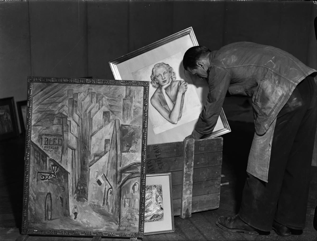 Stadsbud packar upp målningar av konstnären Nils Dardel till en retrospektiv utställning i Göteborgs nations högtidssal, Drottninggatan 7
