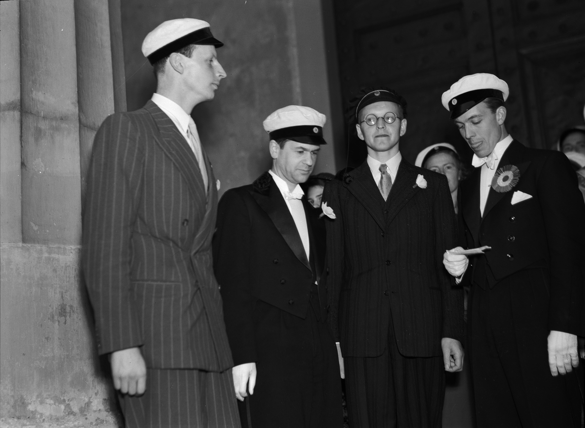 Kurt Lindén, Gunnar von Bahr, Oskar Fjeld och Hans Wijkman på Uppsala Studentkårs vårfest i Botaniska trädgården