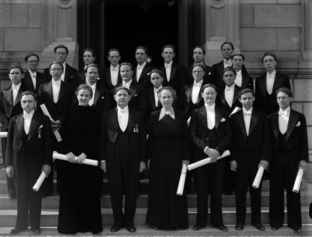 "De nykreerade filosofie doktorerna samlade kring promotor prof. Gregor Paulsson" utanför Universitetshuset