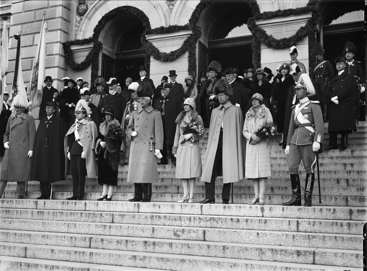 "Jubileumsfästligheterna glansfullt inledda" - kung Gustav V med följe på trappan till Universitetshuset, Uppsala september 1927