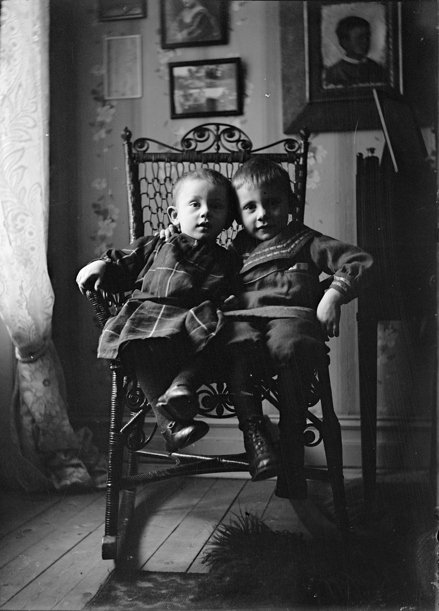 Titel: Alf och Roland Liljefors gungar i gungstol i hemmet, möjligen i Göteborg 1906-1907