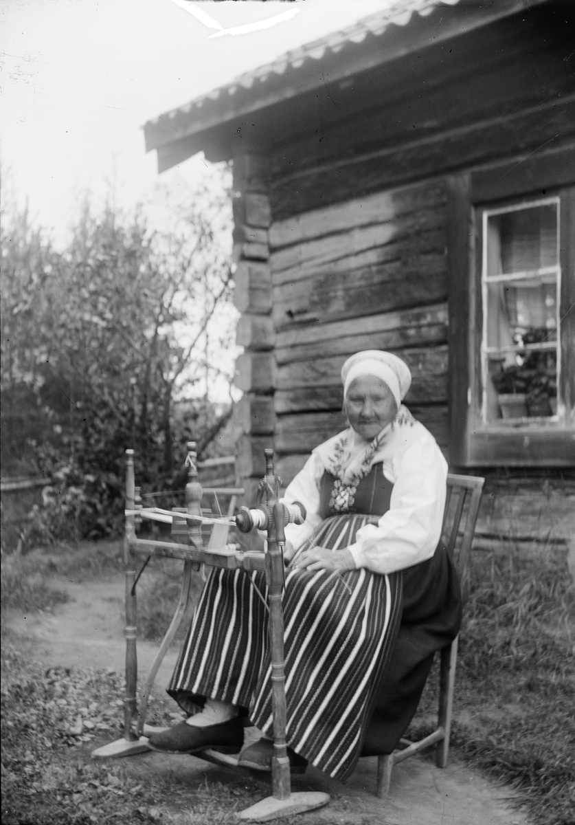 Äldre kvinna, klädd i folkdräkt, ute i trädgård med textilredskap, sannolikt i Dalarna